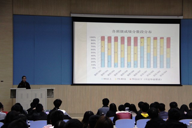 本次大会由辅导员薛慧主持。首先,辅导员通过各个班级优良率、及格率、四六级通过率、学业预警率等直观的数据、图表对上一学期的成绩进行了分析,深入总结了大二学年的学风情况,辅导员表示,希望同学们从上学年的成绩情况对以往的学习态度、学习方法、学习感悟做好总结。同时,辅导员从外出晚归、宿舍用电、校园贷、诚信考试等方面强调了安全、纪律问题。最后,辅导员将2017届毕业生的就业情况及2018届毕业生的保研情况进行了介绍,并就考研出国和就业选择等方面对学生的职业发展和选择进行了引导,她叮嘱同学们一这两届学生的情况作为参考,为自己的未来作出打算,提前准备。