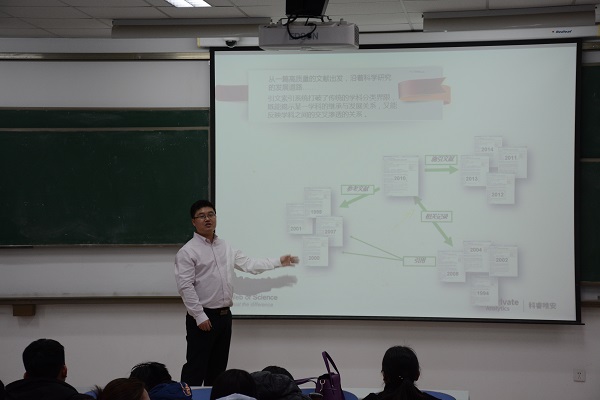 讲座伊始,沈喨喨从广度,品质,核心价值三个方面介绍了为科研人员建立整合的创新研究平台——Web of Science核心合集数据库。WOS筛选了从1900年起的全球优质学术资源,包括SCI、SSCI以及A&HCI等期刊、会议、图书以及化学库等四部分。他表示,引文索引作为一种新的文献检索与分类工具,它打破了传统的学科分类界限,可以将一篇文献作为检索字段从而跟踪一个Idea的发展过程,揭示某一学科的继承发展,交叉渗透关系,越查越深,越查越新,越查越广,从而形成了一个无形的知识脉络。紧接着,沈喨喨从“忆阻器”的实例出发为研究生演示了如何用WOS快速锁定,查找高质量论文并获取全文的方法。锁定高质量文献后,WOS可以从文献计量学的视角捕捉该学科国内外的发展趋势,分析高产出国家、研究机构、科学家乃至基金动向,从而帮助师生选择出有前景的课题。讲座最后,沈喨喨指出WOS不仅是挖掘知识的工具,它还可以从定题,引文两方面跟踪课题最新研究进展,并有效的管理重要文献。