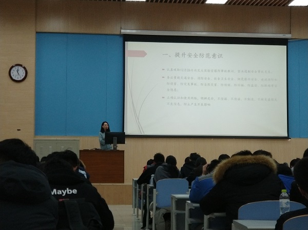 首先,辅导员薛慧就2018年12月26日北京交通大学实验室爆炸事故告诫大家务必认真吸取教训,提升安全防范意识。同时,她还就学生的网络安全、交通安全、消防安全、食品安全等方面进行强调,提醒学生时刻警惕安全隐患。接着,薛慧安排了假期离校学生的公寓安全排查工作,提醒学生假期离校前要进行宿舍安全排查,妥善保管好自己的贵重物品,最后离开宿舍学生切断宿舍电源、锁好门窗,防止安全事故的发生。对于假期留校的学生,薛慧要求与辅导员老师保持联系,配合学校及学院的管理工作。