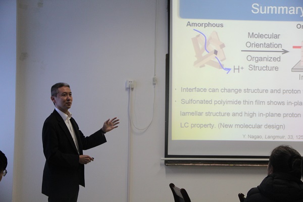 论坛伊始,长尾教授介绍他所在学校及课题组的概况。接着,他引入聚合物电解质燃料电池进入主题,强调离子聚合物的影响。然后他以全氟磺酸膜为例,强调从无序态到有序态的分离差异,并进行相应的分析。长尾教授提出聚合物膜有序的层状结构能够得到高质子传导率,该方法通过基底表面和聚合物之间的界面效应来改变聚合物结构的自由度,增强聚合物膜的质子传导率。他讲述了易溶液晶聚合物,这种物质随着浓度的增加存在着相应的形貌,产生的原因可能是分子内相互作用力,这也为有序结构提供了一种可能性。他认为基底表面和聚合物之间的官能团,润湿性和表面电荷相互作用可以改变聚合物结构的自由度,制备出具有取向结构的膜。最后,在问答环节,长尾教授与在座的年轻教师和同学进行了交流和探讨。