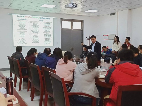 报告伊始,杨全红浅析了传统碳材料用于先进电池和电化学储能技术的挑战,介绍了传统的碳材料有“做不了”和“做不好”的瓶颈,继而讨论了石墨烯所获得的重要机遇和历史使命—石墨烯可以解决传统碳材料中存在的一些问题。接下来,杨全红重点剖析了致密储能的重要性以及石墨烯用于致密储能的理论基础和现实优势;除此之外,杨全红还介绍了其课题组在石墨烯高密组装和高体积能量密度储能材料/器件方面的研究进展并进行了展望。报告结束后,有老师和同学对关于石墨烯所做材料的机械强度方面提出了问题,杨全红耐心的对此问题作出解答并分享其人生感慨“花开有早晚,花期有长短,但都一样灿烂,一样美丽”,这也得到了老师和同学们的认同。