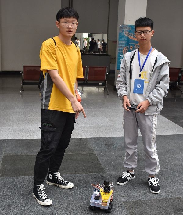 本次比赛共有30支队伍参赛,采用积分制的形式。每支队伍设计两台可移动机器人,分别为哨兵机器人和英雄机器人。哨兵机器人沿引导线到达场球门前禁区,之后触发场地机关,随机点亮该队伍三盏彩色灯中的一盏;英雄机器人则选择合适路径到达资源区,成功将球传进对方球门即可获得相应分数。比赛过程中,双方队员操纵小车进行对抗,争取以最快的速度将球传进球门,参赛队员眉头紧皱,手指快速操控着遥控杆;遇到突发情况,参赛小组冷静地展开讨论,迅速解决问题。决赛由裁判计时,在短短5分钟内,两位主操控者熟练地操作,使比赛气氛推向高潮。比赛结束,场内响起了热烈的掌声,获胜组学生露出了轻松而愉悦的笑容。最后,品如的衣柜队获特等奖,小白集中营队获一等奖,欢乐斗地组队获二等奖。