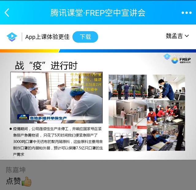2月14日上午9:30,福建联合石化2020年春季招聘空中宣讲会威尼斯国际2299cc(华东)专场在腾讯课堂上线,化学工程学院组织2020届毕业生及部分学生家长参与交流互动。宣讲会由福建联合石化郭立华先生主持,吴小霞女士等企业方相关负责人出席。
