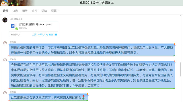 为深入学习贯彻习近平总书记关于新型冠状病毒感染的肺炎疫情重要指示精神,严格落实党中央、国务院决策部署,充分发挥基层党组织和党员干部模范带头作用,坚决打赢疫情防控阻击战,2月27日,化学工程学院2018级学生党员在年级工作组部署下,举行“斗争疫情,负重前行”线上专题学习会,学生党员张志涵主持本次会议,2018级全体党员参加。