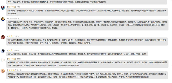此次主题班会,加深了同学们对疫情防控形势的了解,同时也激励着大家与祖国同呼吸、同命运,自觉肩负起自身的责任和使命。同学们纷纷表示,将自觉做好疫情防控,在家开展好各类学习,一切听从学校指挥,用实际行动向奋战在一线的“最美逆行者”们学习。
