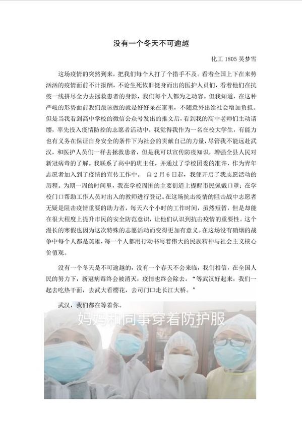 自疫情发生以来,化院心站通过公众号“化院小感”传递暖心能量与身心健康的科学建议,并开展了一系列线上主题活动。此次战“疫”故事的征集活动,让大学生从身边的故事中获得感悟和思考,建立对社会的责任感与使命感,充分展现了学生们对打赢这场全民抗“疫”战争的信心与决心。