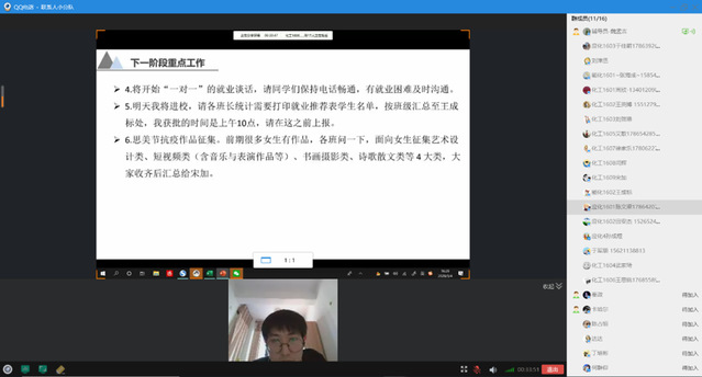 通过本次线上工作会,辅导员与班长之间进行了有效的沟通与交流,为各班班长下一步高效得开展疫情防控、就业和线上学习等工作指明了方向。