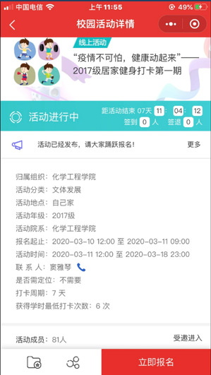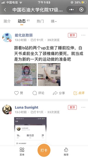 截至目前,已有80名同学报名,并有不少同学已经上传了自己运动的视频或借助keep软件完成了第一次运动打卡。化工(菁英)1707班李富让同学表示,“好久没有运动,感觉自己都快僵硬了,这个打卡活动让我重新开始锻炼,希望自己能坚持下去。”
