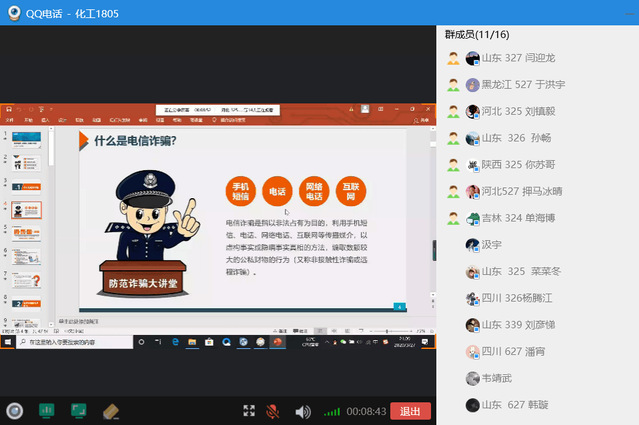 为维护学生们的切身利益,教育学生进一步增强防诈骗意识,预防各类网络电信诈骗事件,3月23日—3月27日,2018级各班级相继开展“预防网络电信诈骗,提高安全防范意识”主题线上班会。