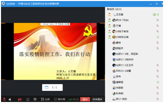 3月27日,环境与安全工程系研究生党支部通过QQ电话开展了“落实疫情防控工作,我们在行动”线上组织生活,会议由支部书记王艺璇主持,全体党员及入党积极分子参加。