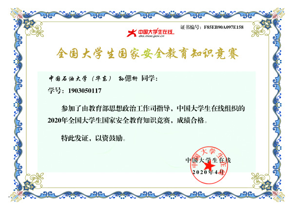 孙偲桁同学国家安全教育知识竞赛合格证书