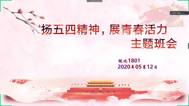 为增强青年学生的爱国情怀,激励学生展现青春风采,5月12日,能化1801班举行“扬五四精神,展青春活力”线上主题班会。会议由班长杜洪龙主持,学院副院长刘欣梅、班主任曹美文、辅导员刘伟以及能化1801班全体学生参加此次活动。
