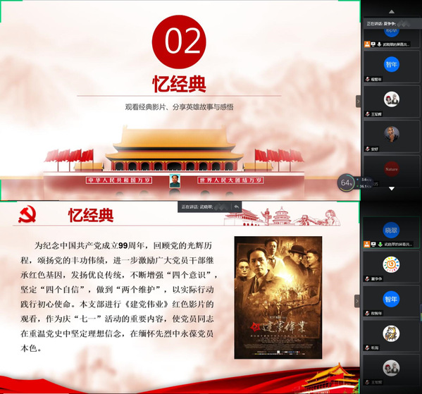 活动伊始,武晓翠同志从疫情期间党员干部怎么做、人民军队怎么干、国际合作怎么开展等方面展开介绍,并强调在疫情防控的关键时刻,我们的党和政府始终是以人民为中心,采取一系列重大举措,这彰显出中国共产党是中国特色社会主义伟大事业稳步前进的根本保证,社会主义制度也在这次疫情中发挥出更明显的优越性。积极评价党支部的刘鹏飞、夏争争等同志疫情防控工作中的表现,并号召大家牢记一名党员就是一面旗帜,这样党旗才会高高飘扬在人民群众当中。