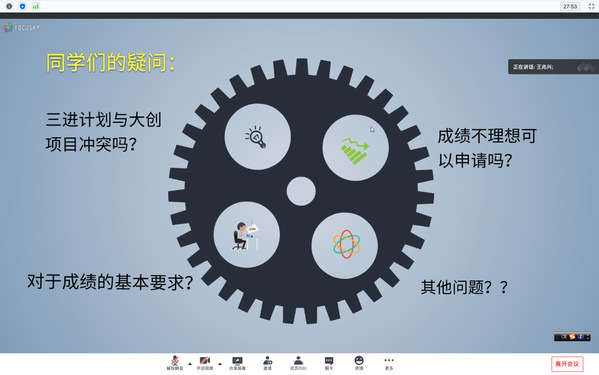 会议伊始,王兆兴解读了“三进”提升计划的相关政策,如“三进”提升计划申报条件、培养方案、相关政策支持等。随后,王兆兴介绍了申报“三进”提升计划学生端操作方法。紧接着,会议进行到答疑环节,王兆兴对学生提出的相关问题进行答疑解惑。