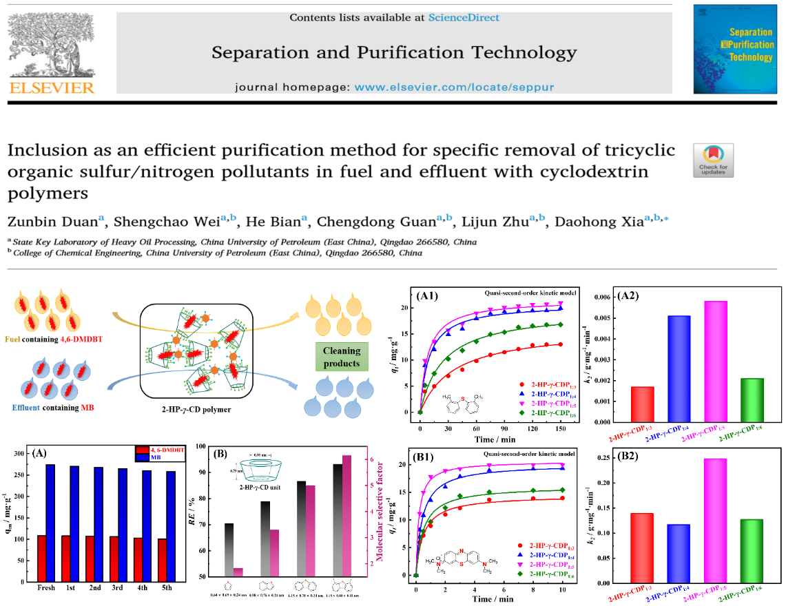 题目为《环糊精聚合物高效包合脱除燃料和废水中三环有机硫/氮污染物》(Inclusion as an efficient purification method for specific removal of tricyclic organic sulfur/nitrogen pollutants in fuel and effluent with cyclodextrin polymers)的论文发表在权威期刊Separation and Purification Technology上,研究人员以四氟对苯二甲腈为交联剂,合成了一种新型的2-羟丙基-γ-环糊精聚合物(2-HP-γ-CDP),用于特定包合脱除油/水相中的三环硫/氮污染物。系统性地研究了2-HP-γ-CDP对于燃料中4,6-二甲基二苯并噻吩和废水中亚甲基蓝的脱除性能,发现当合成过程中2-HP-γ-CD与TFTPN的物质的量比为1:5时,2-HP-γ-CDP1:5具有最佳的脱除性能,其纯化燃料的效果几乎是商用活性炭的15倍。该研究为基于环糊精包合机理的清洁生产技术开发提供了重要思路和理论基础。