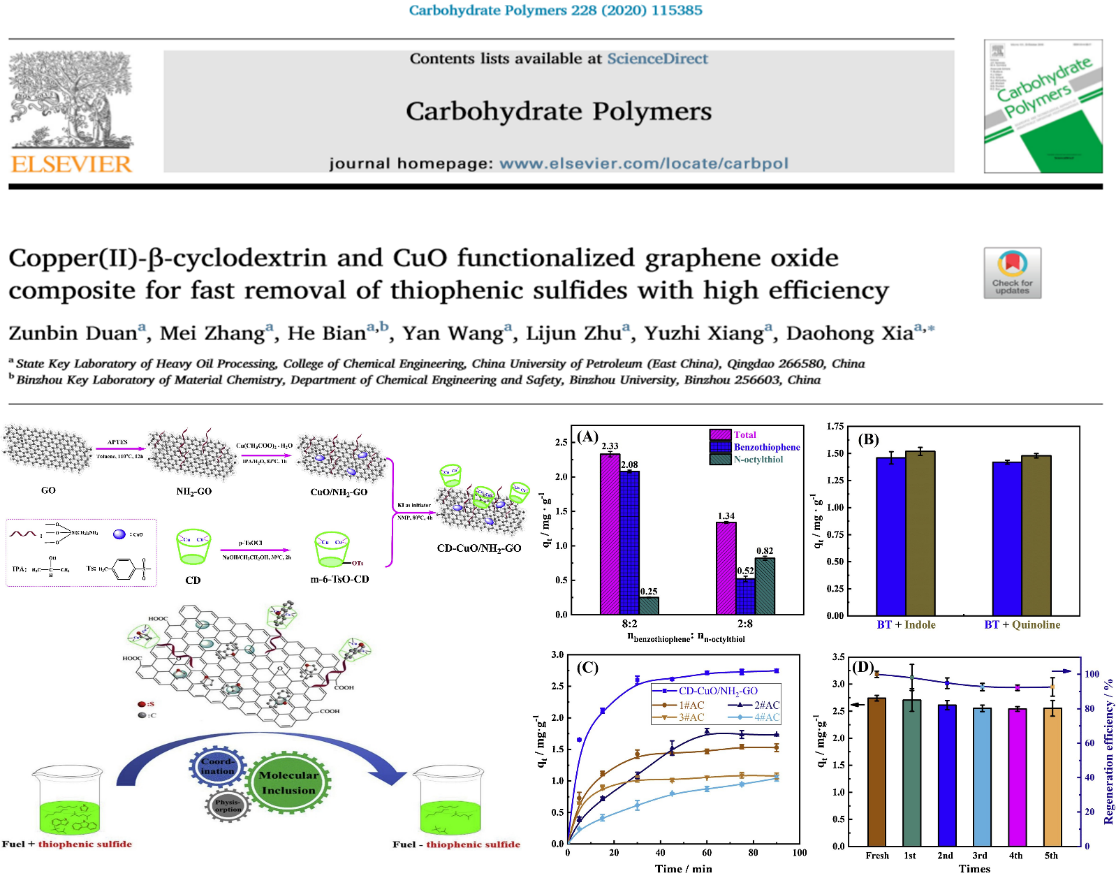 题为《铜(II)-环糊精和CuO功能化的氧化石墨烯复合材料用于快速高效去除燃料中噻吩类硫化物》(Copper(II)-beta-cyclodextrin and CuO functionalized graphene oxide composite for fast removal of thiophenic sulfides with high efficiency)论文发表在权威期刊Carbohydrate Polymers。燃料油品中有机硫化物含量最多的是不同类型的噻吩类硫化物,因此,研究绿色高效且价廉的脱除噻吩类硫化物的非加氢脱硫技术非常重要。本项工作利用Cu(II)-β-CD与CuO对石墨烯材料进行功能化,制备出新型环糊精基氧化石墨烯复合材料CD-CuO / NH2-GO,并对CD-CuO / NH2-GO的结构、脱硫性能和脱硫机理等进行了详细研究。为后续研究非加氢脱硫技术提供了重要理论指导和研究思路。