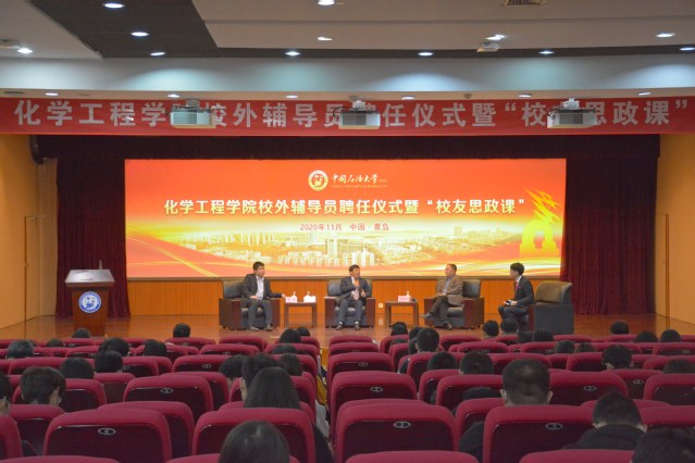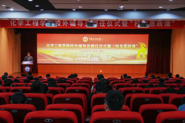 为了进一步凝聚育人合力,推动思政工作创新发展,11月8日,化学工程学院在逸夫礼堂举办校外辅导员聘任仪式暨“校友思政课”活动,聘任山东源根石油化工有限公司总工程师、加工82级校友袁俊洲,青岛惠城环保科技股份有限公司董事长、加工88级校友张新功,全国劳动模范、化工02级校友张磊,青岛石科化工技术有限公司总经理、应化10级校友满聪为校外辅导员。学校党委副书记万云波、党委学生工作部(处)部(处)长姚海田,学院院长杨朝合、党委书记李国、党委副书记王迅、院长助理陈小博出席仪式,班主任与学生代表参加活动。