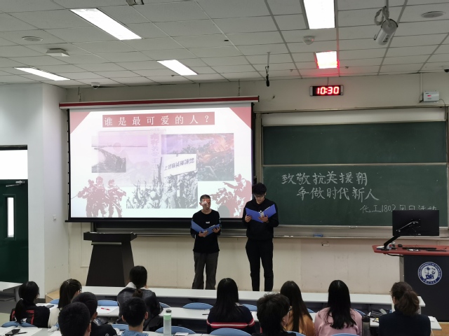 活动伊始,班长邵思程对本次团日活动的流程进行了简要说明,并通过观看视频资料的形式带领大家共同了解了抗美援朝战争的背景。接着,学生党员孙玉分享了革命先辈罗盛教的故事,帮助同学们更好地认识和了解抗美援朝中涌现出的英雄人物。同学们还集体观看《我的抗美援朝故事》,通过抗战老兵们的事迹分享,让同学们切身感受到革命前辈始终不渝的理想信念和视死如归的英雄气概。邢浩森和刘腾龙饱含深情地朗读《谁是最可爱的人》,表达出同学们对志愿军战士的热爱与崇敬,对牺牲烈士的祭奠与缅怀。最后,杨朝合对本次主题团日活动进行了总结。他结合国家发展情况和自身经历勉励同学们,要不忘初心、牢记使命,将来无论是继续学习深造还是走向社会,都要坚定理想信念,发扬“抗美援朝精神”,做一名爱党爱国爱人民、有理想、有本领、能担当的新时代新人。