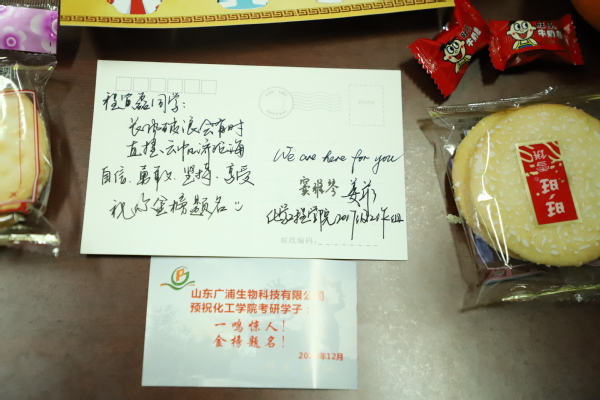 考研学生收到礼物和文章鼓励后都表示充满了前行的动力,其中化学工程与工艺1701班刘妍汝表示:“年级为我们送温暖的活动让我感到非常开心和暖心。在考研复习关键阶段,我一定会迎难而上,坚持到底,不给自己留遗憾!”