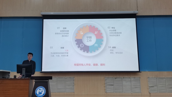 会议伊始,王兆兴引导学生思考自身当前定位以及学业规划,鼓励同学们从现在做起,全方位提升自己,以更好的姿态面对即将到来的生活。紧接着,王兆兴就读研与求职进行了分析,建议同学们提前做好未来规划,并强调美好的未来只有通过奋斗才可以实现。然后,他对上学期期末成绩进行了分析,向学生展示了每个班级的及格率、优良率等数据,使学生对自身成绩有了更清晰的认识,鼓励同学们向榜样看齐,提高自身学习能力。最后,耿旭超重点强调对请假外出、宿舍内务检查、晚上安全汇报等管理工作,要求大家认真落实学院相关要求及规定,做到自律自强。