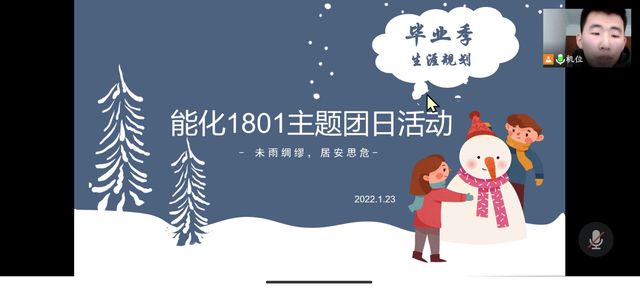 临近毕业,为解答同学们关心的考研复试、毕业设计、就业等问题,1月23日,能化1801班举行“未雨绸缪,居安思危——毕业季生涯规划”线上主题班会。会议由班长宋雨寒主持,联系班级的院长刘欣梅,班主任郗丽君、班导师曹美文、于道永、能化1801班全体学生以及部分学生家长参加此次活动。