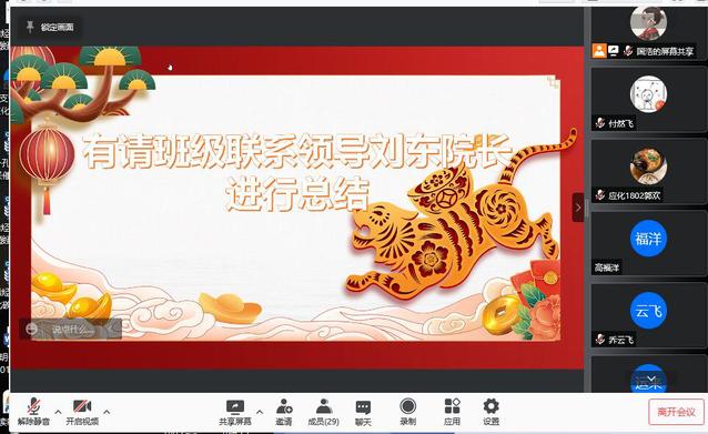 为更好的总结过去,解答同学们关心的毕设、复试、就业等问题,为大学最后阶段做好准备,2月9日,应化1802班举行“虎虎生威,扬帆再起航”线上主题班会。会议由班长国浩主持,联系班级的副院长刘东,班主任杨修洁以及班级全体同学参加。