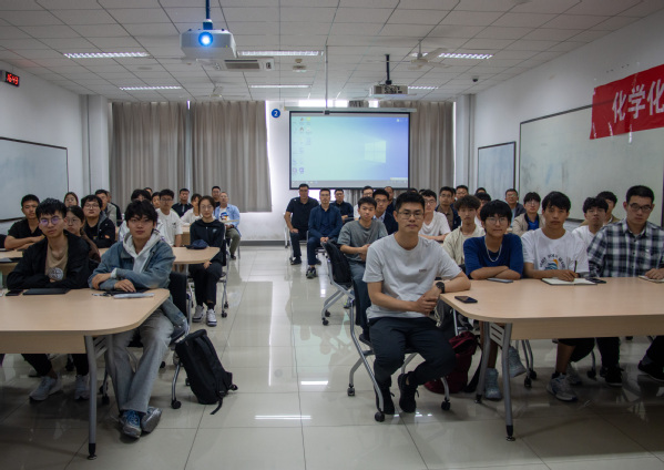 活动伊始,魏雯晓指出此次“企业导师进课堂”对于学生而言的意义所在,并介绍了主讲人曹传洋、刘良群。曹传洋作为第一位主讲人,用宣传短片向在场学生介绍抚顺石化企业的工作地点、生产装置与运行体系。然后,他通过详细的生产装置图着重讲解重油催化裂化概况及工艺原理,他讲到此工艺是是在催化剂的作用下,选择适当的操作条件以吻合正碳离子的单离子与双分子两部分反应从而生成气体、汽油等产物;紧接着介绍了烟机能量回收、余热炉、烟气脱硝、烟气脱硫、产品精制等八大原理。最后他希望化院的学生能够掌握扎实的基本功,在未来工作中可以将知识灵活运用。刘良群作为第二位主讲人以洗衣液在生活中广泛应用为例引出他所分享的内容:洗化厂磺化工艺装置工艺。他讲到抚顺石化关于这方面在市场中广泛应用;他通过流程图详细讲解了磺化这一过程所需的原材料与其以熔硫和干燥的空气燃烧,在有机物中发生一系列反应的工艺原理。